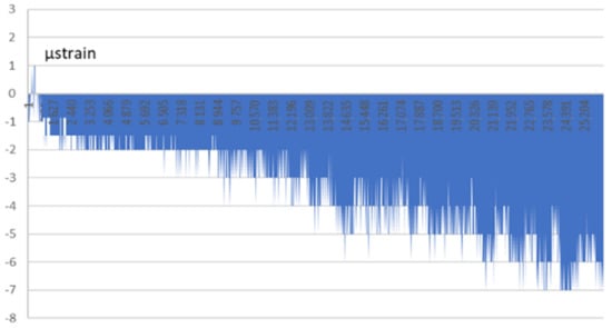As already mentioned, optical FBG sensors also make it possible to determine strain values. Example strain measurement results obtained for a wall under a 5 kN load from the floor slab placed above it are presented in Figure 15. A relatively small strain of about 7 μstrain (a millionth) can be observed together with n measurements performed by the FBG-800 optical interrogator with a measuring frequency of 100 Hz. This type of sensor enables structural monitoring of building structures.