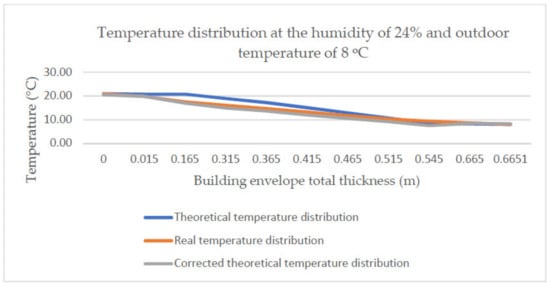 Temperature distribution at the humidity of 24% and outdoor temperature of 8 °C together with the corrected distribution.
