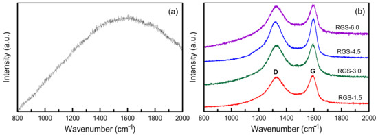 Figure 3 shows the Raman spectra of the RH-SBA-15 and RH-GO/SBA-15 samples. No peaks are present in the spectrum of RH-SBA-15 (Figure 3a). For the RH-GO/SBA-15 material, the spectrum has strong G and D bands at approximately 1588 and 1351 cm−1, respectively (Figure 3b). Table 1 lists the peak intensity and ID/IG ratio, which ranges between 0.9664 and 0.9760. The ID/IG ratio slightly increased with an increase in the amount of GO suspension from 1.5 to 6.0 g. The RH-GO/SBA-15 samples had high ID/IG ratio probably because they contained more oxygen functional groups and vacancy defects than the pure RH-SBA-15 samples. This observation indicated that all RH-GO/SBA-15 samples had a high degree of oxidation [35].