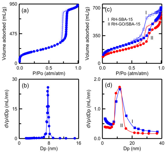 Figure 7. Nitrogen sorption isotherms and pore size distributions: (a,b) T-SBA-15; (c,d) RH-SBA-15 and RH-GO/SBA-15.