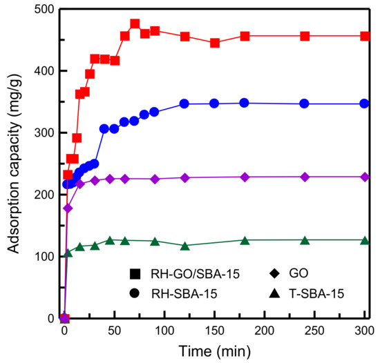 Figure 8. Comparison of adsorption capacity of GO, T-SBA-15, RH-SBA-15, and RH-GO/SBA-15.
