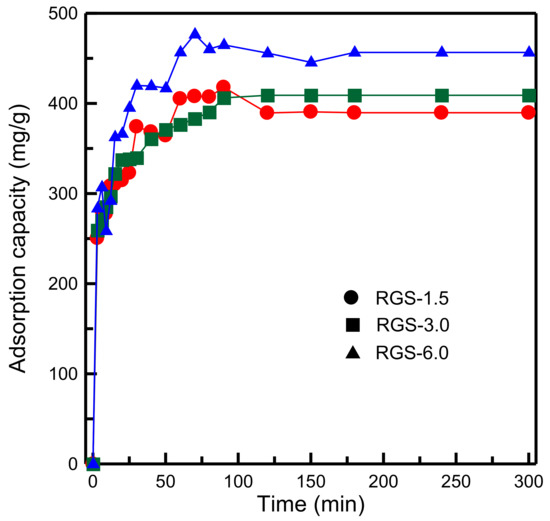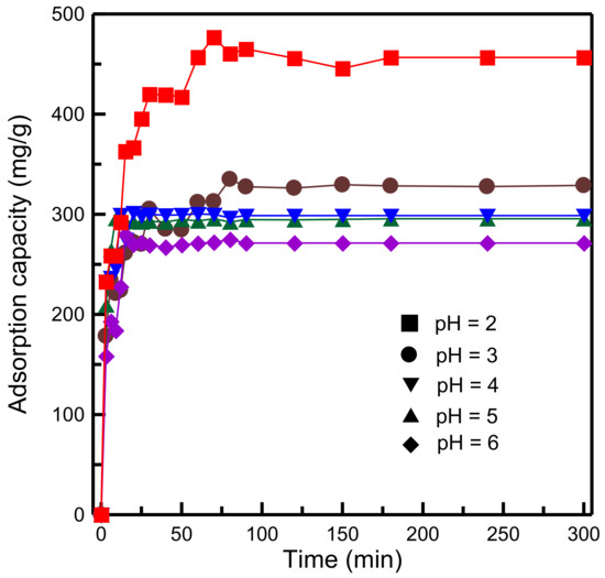 The gelation pH plays a crucial role in the synthesis of the mesoporous framework of SBA-15 because surfactant micelles form at the optimum pH. Figure 9 shows that the adsorption capacity decreased with an increase in the pH from 2 to 6. The adsorption capacity was highest (456.63 mg/g) at pH 2 and lowest (298.66 mg/g) at pH 6. XRD analysis (Figure 1a) indicated that the gelation pH affected the pore tissue of RH-GO/SBA-15. In a strongly acidic environment (pH 2), the formation of the hexagonal framework was mainly attributed to the micelle-silica interaction [40]. The adsorbent exhibited highly ordered channels with a mesoporous structure, which favored delivery of the dye into the interior of RH-GO/SBA-15 but was unfavorable to the formation of surfactant micelles when the pH was higher than 3. The reason for the decrease in MB adsorption may have been degradation of the pore structure. To prevent such degradation, RH-GO/SBA-15 was synthesized at pH 2 in subsequent adsorption experiments.
