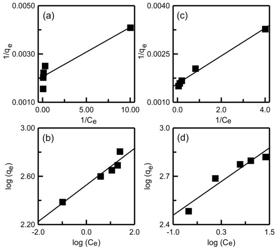 Figure 13. Adsorption isotherms of dye onto adsorbents: Langmuir model for (a) RH-SBA-15 and (c) RH-GO/SBA-15; Freundlich model for (b) RH-SBA-15 and (d) RH-GO/SBA-15.