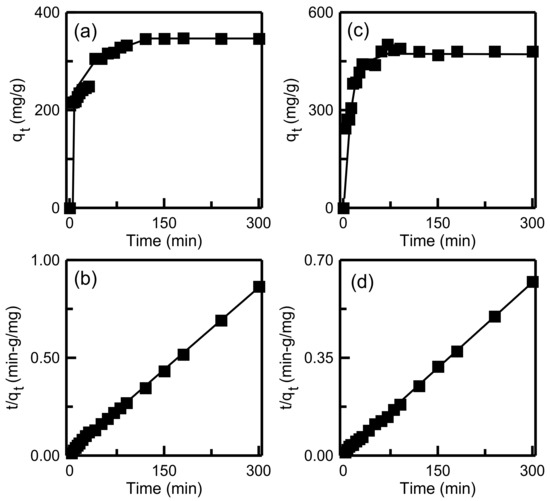 Figure 14. Adsorption kinetics of dye onto adsorbents: pseudo-first order model for (a) RH-SBA-15 and (c) RH-GO/SBA-15; pseudo-second order model for (b) RH-SBA-15 and (d) RH-GO/SBA-15.