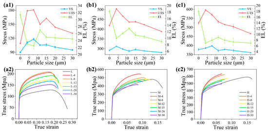 The (1) mechanical properties (yield strength (YS), ultimate strength (UTS), and elongation (EL)) and (2) true stress–true strain curve of the composites with (a) matrix L, (b) matrix M, and (c) matrix H reinforced by particle sizes of 4.1, 7.7, 11.3, 14.8, 19.6, and 29.9 μm, separately. The 0 μm particle size represents the unreinforced matrix.