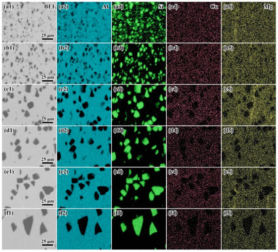 The typical EDS mapping of (a) H-4, (b) H-8, (c) H-12, (d) H-15, (e) H-20, and (f) H-30. The results of (1) backscattered electron image, EDS mapping of (2) Al, (3) Si, (4) Cu, and (5) Mg are shown in every group.