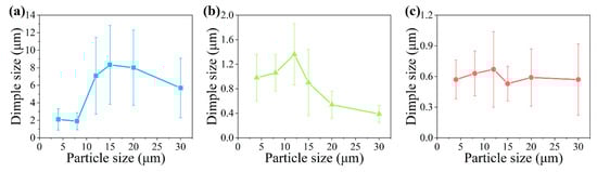 The elongation of the composite increased with the increasing particle size when the particle size was smaller than 12 μm. After the particle size increased up to 12 μm, the elongation of the composite began to decrease with increasing particle size. The particle size has a critical size in a composite to obtain the maximum elongation value. When a composite with a small particle deforms, the strong resistance of the particle to the dislocation movement limits the matrix deformation into small regions where the tiny cavities are generated [33]. In the high-level stress state, these tiny cavities and cracks of the particle connect and the main crack is generated. The fracture surface composed of many tiny dimples is formed as shown in Figure 4d,g. When particle size increases, this resistance decreases, and the deformation ability increases. The voids in a wider range can aggregate, and the dimple size increases, as shown in Figure 5. However, the increase in the particle size also reduces the particle strength, which increases the particle cracking [38]. With increasing particle cracks, the dominant failure mechanism factor changes from matrix-induced damage to particle-induced damage [33]. The increasing particle cracking will decrease the deformation stability and lead to early fracture of the composite [11]. The earlier the fracture occurs, the less the growth of the dimple, which leads to the smaller size of the dimple, as shown in Figure 5. The interaction of these two factors determines the rise–fall changing character of the composite elongation. When a composite is designed to have good ductility, the particle should have a size close to the critical size. In this work, the critical size was approximately 12 μm.