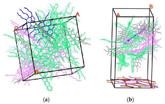 Molecular modeling and dynamic simulations included quantifying the interfacial mechanical properties, interfacial energy, and adhesive work of the asphalt-binder-aggregate (mineral) bond interaction. For the asphalt, we selected a four components model, and for the detailed molecular components, refer to Zhou [29]. For the mineral component we selected three different oxides (Al2O3/SiO2/CaO) from the models library of Materials Studio software 8.0. The asphalt model was built first, then the asphalt binder-aggregate model was built using a layer model. The layer model of asphalt binder-aggregate model was treated by geometry optimization. Additionally, the NVT and NPT ensembles were used to calculate the detailed parameters with the total times of 100 ps. The simulated density and energy values were verified by experiments first. If, the simulated data can be identical with experiments, only the data of molecular dynamic simulation can be used. These model simulations and their corresponding mathematical computations are discussed in the subsequent texts.