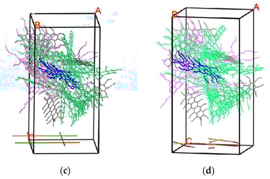 The interfacial models of the asphalt-binder-mineral bond: (a) asphalt binder (blue represents aromatics; grey represents saturates; green are asphaltenes; and purple are resins); (b). asphalt-binder-Al2O3; (c) asphalt-binder- SiO2; (d) asphalt-binder- CaO.