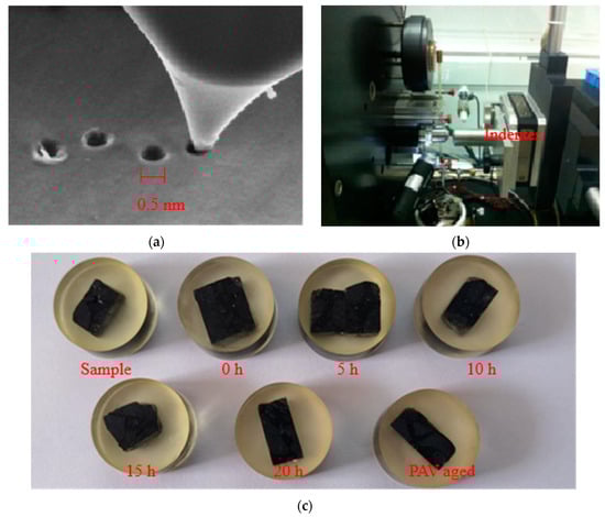 Figure 2a is a photographical illustration of the process of indenting asphalt materials with a diamond tip. Figure 2b is the parts of the test equipment, including indenter head and displacement sensor, asphalt sample, and sample thermocouples, etc. Figure 2c is the asphalt sample for nano-indentation testing.