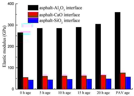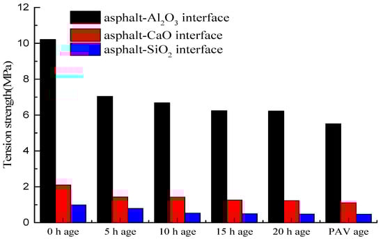 In this study, the mechanical properties of the interface between the asphalt-binder and aggregates mainly included the interfacial tensile strength, compressive strength, and elastic modulus, which were quantified to better understand the interaction between the asphalt-binder and aggregates. As shown in Figure 3, the tensile strength of asphalt-binder-aluminous rock (Al2O3) interface is significantly greater than that of the asphalt-binder-basalt (SiO2) interface and asphalt-binder limestone (CaO) interface, respectively. The reason is that the Al2O3 could form the covalent bond with asphalt components, while the CaO could not. Moreover, atoms have overflowed from the layer of CaO. This suggests better affinity and bonding for the asphalt-binder and the aluminous rock aggregates.
