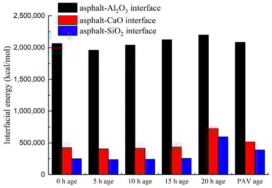 As shown in Figure 6, the interfacial energy of the asphalt-binder-aggregate (mineral) interface did not change significantly as a function of aging, but was considerably different for different aggregate (mineral) types. In the figure, the interfacial energy is relatively higher at 0 h aging, decreases slightly for 5 h aging, and then increases progressively through to 20 h short-term aging, and thereafter declines slightly again for PAV aging. In general, the results in Figure 6 suggests that aggregate type (e.g., Al2O3) was more impactful on the interfacial energy of the asphalt-binder-aggregate (mineral) interface than aging. That is oxidative aging with time can detrimentally promote stripping of the asphalt-binder from the aggregates (minerals) whilst the use of aggregates (minerals) such as Al2O3 can potentially aid to mitigate stripping. Overall, it can be concluded from Figure 6 that aggregates rich in the Al2O3 mineral had good adhesion with the asphalt-binder and registered a high interfacial energy with high potential for stripping mitigation.