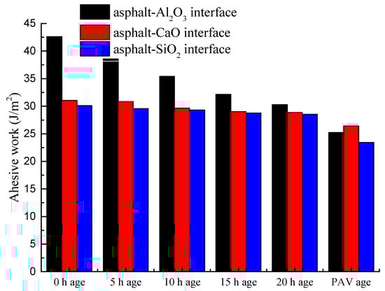 In this study, the adhesive work concept was used to model and better understand the interfacial properties of the asphalt mixtures, particularly with respect to adhesive bonding. The higher the adhesive work is, the better the adhesive properties and bonding of the asphalt-binder-aggregate (mineral) interface are, and vice versa. With the exception of PAV aging, Figure 7 shows that the adhesive work of the asphalt-binder-aluminous rock (Al2O3) interface is the highest followed by CaO and lastly, SiO2.
