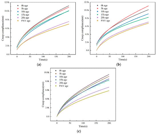 To verify the dynamic modeling and simulation results, the micro-mechanical nano-indentation response-behavior of the asphalt mixtures (namely the asphalt-binder-aggregate mixture samples) were investigated and comparatively quantified as a function of aging. As shown in Figure 8, the creep deformation of the asphalt mixtures decreased with an increase in aging time, with the PAV aged samples registering the lowest creep deformation. That is the depth of indentation decreased as the aging time increased, with the least depth of indentation recorded for the PAV aged samples. As theoretically expected, the highest indentation was registered for the 0 and 5 h aged samples followed by the 10- and 15-h aged samples. As can be seen in the figure, the 20 h and PAV aged samples’ creep compliance response curves are relatively close to each other for all the aggregate (mineral) types.
