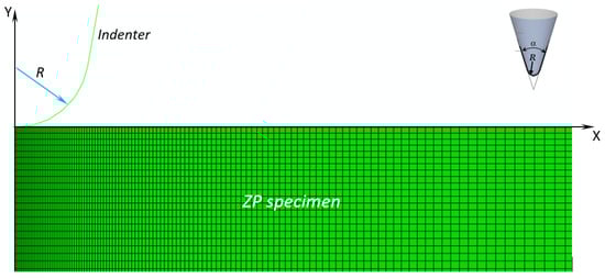 Figure 1). The axis of symmetry Y of the FE model represents the indentation direction. By moving the rigid blunt cone in the negative Y-direction, the load is transferred to the ZP slab whose bottom edge is clamped and a reaction force is developed at the contact interface.