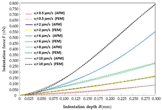 Section 2.1, the actual indentation depth used in the AFM measurements ranged between 416 and 1020 nm for the different indentation rates. However, some nanoindentation curves recorded experimentally have a locally unstable behavior where the force–indentation trend is not strictly monotonic. To overcome this problem, indentation depth was limited to 300 nm in the FE simulations as all force–indentation curves remain strictly monotonic within this range. The selected 300 nm indentation range was indeed representative of the whole force–indentation curve obtained for each indentation rate. In fact, each