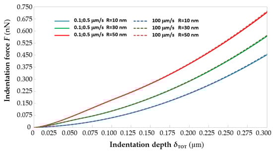 Furthermore, in order to investigate the relationship between probe shape and indentation rate, for each AFM tip radius, the rate was set equal to 0.1 μm/s, 1 μm/s, 10 μm/s and 100 μm/s, thus covering a 50 times broader range than the one considered in the nanoindentation experiments (i.e., 0.5–10 μm/s). Following the steps explained in [