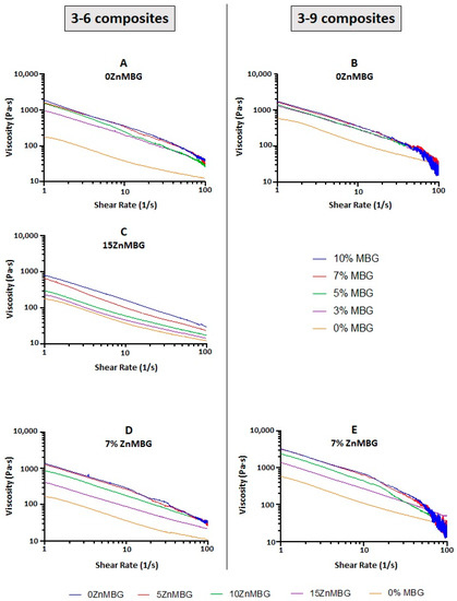 In order to investigate how the integration of MBG affects the rheological properties of algMC blends, different amounts (0, 3, 5, 7 and 10%) of 0ZnMBG (basic MBG containing 15% Ca) were added into both, 3–6 and 3–9 blends. The plots of both the 3–6- and 3–9- based composites with 0ZnMBG show that viscosities of all the composites containing 3–10% MBG were closer together, while the MBG-free control showed a clearly lower viscosity (Figure 2A,B). Increasing the amount of added MBG induced an increase in the resulting composite’s viscosity, making mixing of the glass particles and their even distribution within the inks more difficult, especially in the case of the 3–9 blend.