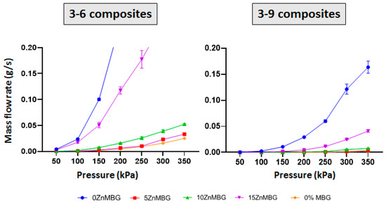 Mass flow analysis of 3–6 and 3–9 composite inks containing 7% of each ZnMBG as well as control inks without MBG at increasing pressures from 50 up to 350 kPa. Values on the plots are means ± SD, n = 3.