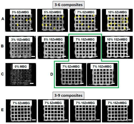 Stereo-light microscopic images of 3D scaffolds printed using different inks. (A) The 3–6 composite inks containing 3, 5, 7 and 10% of 0ZnMBG (15% Ca), yellow arrows show agglomerates of added MBG, (B) 3–6 composite inks containing 3, 5, 7 and 10% 15ZnMBG (0% Ca), (C) 3–6 ink without any MBG, (D) 3–6 composite inks containing 7% of 5ZnMBG (10% Ca) and 7% of 10ZnMBG (5% Ca). Green line marks selected combinations of 3–6 composite inks for further experiments, (E) 3–9 composite inks containing 7% of each ZnMBG. Scale bars represent 2 mm.