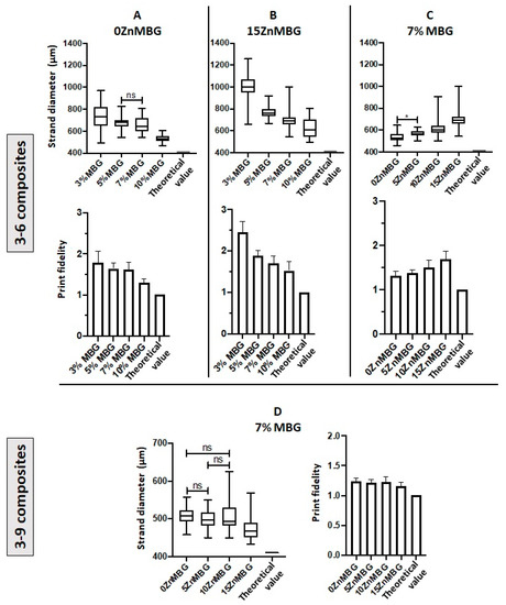 Strand diameters and print fidelities of 3–6 and 3–9 composite scaffolds. (A) Strand diameters (upper) and print fidelity (lower graph) of scaffolds printed with 3–6 composites containing different amounts of basic MBG without incorporated Zn (15% Ca). (B) Strand diameters (upper) and print fidelity (lower graph) of scaffolds printed with 3–6 composites containing different amounts of 15ZnMBG (0% Ca). (C) Strand diameters (upper) and print fidelity (lower graph) of scaffolds printed with 3–6 composites containing 7% of each ZnMBG. (D) Strand diameters (left) and print fidelity (right) of scaffolds printed with 3–9 composites containing 7% of each ZnMBG. Value 1 in the shape fidelity charts corresponds to the inner diameter of the extrusion nozzle of 410 µm (theoretical optimum). All strand diameters are significantly different from the theoretical optimum within each graph with p < 0.0001, except for *, which has p < 0.05, and “ns”, which are not significant; Values are means ± SD, n = 3.