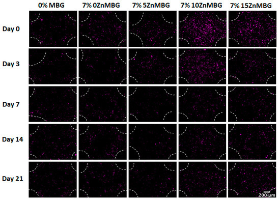 The first bioprinting experiment was performed with 3–6 composites (data not shown), but the addition of 100 µL of cell suspension per gram of the ink highly affected viscosities of inks and decreased their printability but also the stability of the crosslinked constructs in cell culture medium over time. Scaffolds containing 10ZnMBG and 15ZnMBG (5 and 0% Ca, respectively) were stable for the entire duration of the experiment, but those containing 0ZnMBG and 5ZnMBG (15 and 10% Ca, respectively) were falling apart by day 14. Even though 0ZnMBG 3–6 had good printability, scaffolds showed low stability during culture. Therefore, bioprinting experiments were performed only with 3–9 composites. Addition of cell suspension to 3–9 composite inks induced a decrease in viscosity as well, but print fidelity was not affected. Vybrant DiD pre-relabeled cells encapsulated in composite scaffolds were observed immediately after printing and after 3, 7, 14 and 21 days of culture of the printed and crosslinked scaffolds (Figure 6). It appears as if more cells were present in the case of higher Zn amount (10ZnMBG and 15ZnMBG) right after printing (day 0), but their number decreased over time.