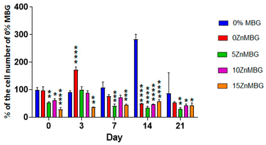 Determination of cell number was performed by DNA quantification using composite scaffolds and MBG-free control. Cell number development over time is shown in Figure 7 as a percentage of the number of cells of MBG-free control at day 0 (right after printing). Cell numbers stayed stable in scaffolds printed with 3–9 algMC bioink without any MBG during 14 days and then sharply increased, while all composite scaffolds contained significantly less cells (p < 0.0001). Directly and three days after printing, the cell numbers in composite scaffolds containing Zn-modified MBG was significantly lower than those in composite scaffolds containing 0ZnMBG; at later cultivation time points (days 7, 14, 21), this effect of Zn-modification was not observed.