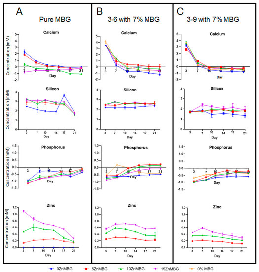 Release of different ions (A) from bulk MBG and (B) from cell-laden 3–6 and (C) 3–9 composite scaffolds containing 7% of each ZnMBG during 21 days; since no Zn was released from 0ZnMBG (blue line) and from 0% MBG (orange line) samples (data not shown), these values are not presented in (B,C). Values for released concentrations of Si from 0% MBG are not presented in (B,C) for the same reason. Values are means ± SD n = 3.