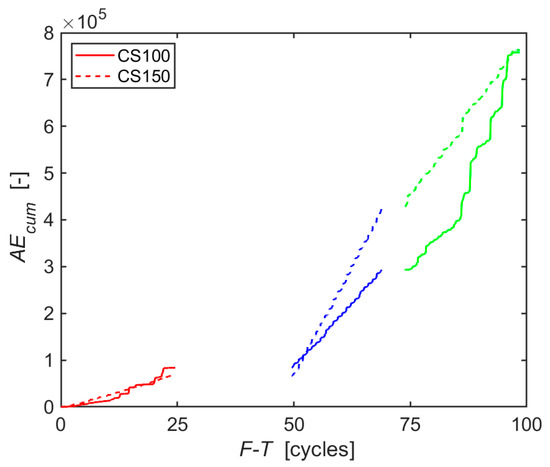 In contrast to the abovementioned tests, the AE method allows monitoring of the given state of each test specimen throughout the entire test. The AE method therefore indirectly describes the behaviour of test specimens during F-T cycles. To evaluate the acoustic emission records, the number of counts (over the set threshold level) in its cumulative form (AEcum) during F-T cycles was initially selected. The course of the cumulative number of counts over time shows AE activity, with higher AE activity corresponding to higher damage/failure, as is shown for example in [37]. The graph in Figure 2 presents a very similar character of AEcum courses during the first 25 F-T cycles for both sizes of the test specimens. The cumulative curves for individual specimens do not differ significantly even in the later course of F-T cycles. This was one of the reasons why the experimentally obtained data of cumulative counts were interpolated with straight lines. The slope of the lines for both sizes of the specimens did not differ much during the first 25 F-T (Table 4). A change in the slopes of the interpolated lines occurs only during 50–75 F-T cycles, when the increase for larger specimens CS150 is significantly higher. Bearing in mind that the mechanical properties have not been affected (Table 3), this indicates a formation of small failures in large numbers. Nevertheless, in the last stages of the freezing cycles (from 75 to 100 F-T cycles), the smaller specimens CS100 exhibit a higher growth of AE activity, as can be seen in Table 4.