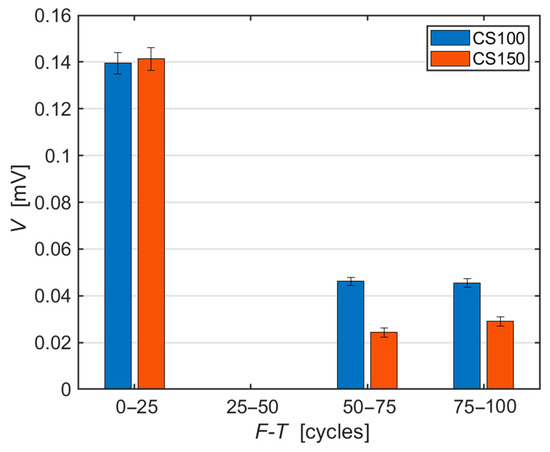 The amplitude of the recorded AE hits indicates the degree of the emerging material damage. More significant damage to the material structure generates a higher signal amplitude, as shown for example in [38]. The height of the amplitude (see Figure 3) now shows more significant differences between the individual sizes of the tested specimens. While the amplitudes remain the same, within the measurement error, during the first 25 F-T cycles, a higher amplitude was recorded for the CS100 specimens in the subsequent cycles. This trend may indicate a greater degree of damage to these smaller specimens. This in fact corresponds to the changes of the slope in Table 4, respectively in the graph in Figure 2.