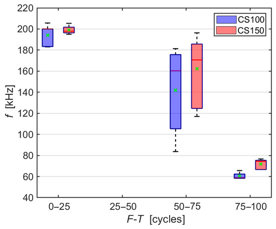 Box plot of development of dominant frequency values of AE hits during F-T cycles.