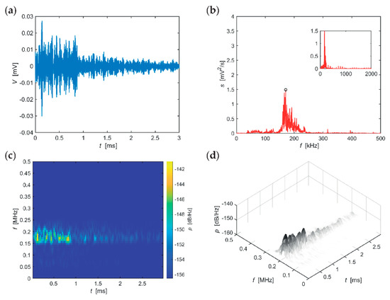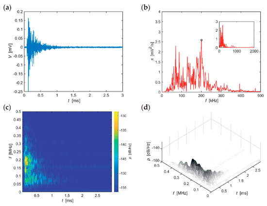 The significant frequency spectrum, see the series of graphs in Figure 9, is in a very narrow band 140–230 kHz but exhibits relatively long duration—more than 3 ms. At the most significant frequency of 171 kHz, attenuation of spectral density is 6 dB/(Hz∙ms), however, the spectrum shows apparent rapid attenuation—approximately 1 ms. These data apply to CS150 specimens between the 50th and 75th F-T cycle.