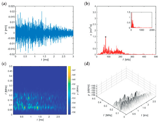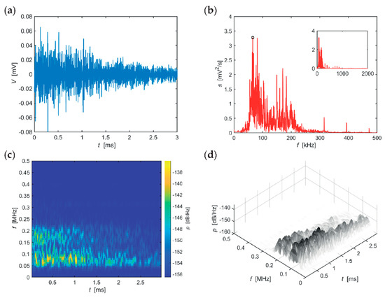 Visualisation of the recorded AE signal during 75–100 F-T cycles from specimens CS150: (a) time course of the amplitude, (b) frequency spectrum, (c) spectrogram STFT-2D image, (d) spectrogram STFT-3D image.