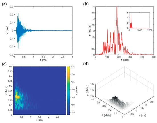 The following series of evaluations, include typical AE hits recorded in individual stages of the F-T cycles for the individual sizes of the test specimens. The time-frequency spectrum of the power spectral density [42] (Figure 5c, Figure 6c, Figure 7c, Figure 8c, Figure 9c and Figure 10c) was calculated using a Short Time Fourier Transform with a Kaiser window. On the horizontal axis, the graph shows the time shift of the frequency, which is projected on the vertical axis. The size of the power spectral density is determined by the colour tones. The decibel scale is basically a linearization of the logarithm, i.e., [43],