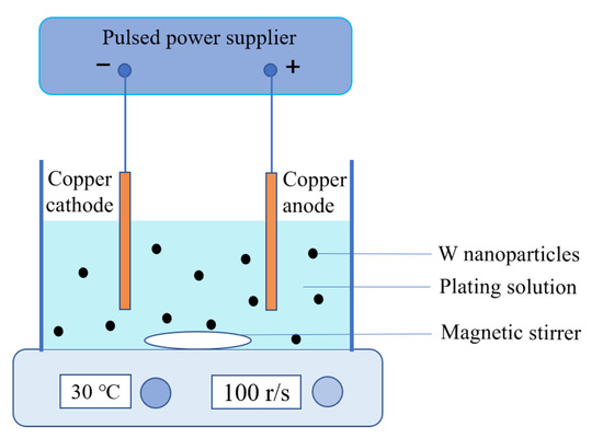 The composition of the plating solution was CuSO4·5H2O (125 g/L), H2SO4 (200 g/L), NaCl (60 mg/L), polyethylene glycol (PEG, 0.2 g/L), and sodium dodecyl sulfate (SDS, 0.1 g/L). All chemical reagents are analytical reagents, provided by Sinopharm Chemical Reagent Company (Shanghai, China). Then, nano-W powder (10 g/L) was added to the plating solution for composite electroplating. The electroplating process parameters are shown in Table 1. The samples under different conditions were prepared by changing the forward and reverse duty cycle of the pulse current. Before electroplating, Cu plates were polished with a series of silicon carbide sandpaper (STARCKE MATADOR, Melle, Germany) in the order of 800, 1000, 1200, 1500 and 2000 mesh to prevent contaminations. Subsequently, H2SO4 (5 vol.%, Sinopharm Chemical Reagent Company, Shanghai, China) and HCl (10 vol.%, Sinopharm Chemical Reagent Company, Shanghai, China) solutions were used for activation. Finally, the Cu plate was cleaned using anhydrous ethanol (Sinopharm Chemical Reagent Company, Shanghai, China). After pulse plating, the samples were gently washed with absolute ethanol (Sinopharm Chemical Reagent Company, Shanghai, China) and dried in an oven at 60 °C.