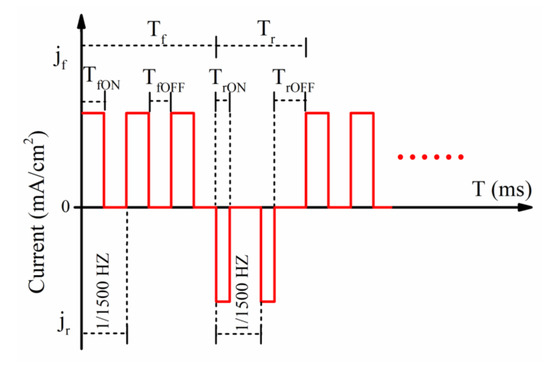 The schematic diagram of forward- and reverse-pulse currents to prepare tungsten-copper (W–Cu) composite coatings.