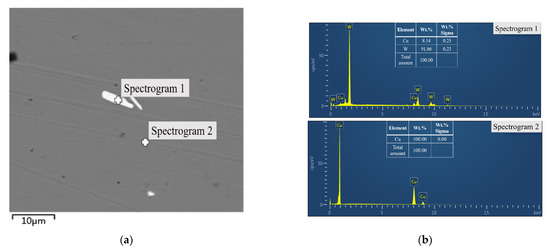 In order to observe the internal structure of W–Cu composite coatings, composite coatings were cut perpendicular to the surface. Then the cross section was polished with sandpaper to test the cross-sectional morphology of samples. samples were also prepared using an ion thinner for TEM observation. Figure 5 presents the cross-sectional SEM images of W–Cu composite coatings with different forward duty cycles. All observed in the picture are composite coatings obtained by electroplating, and there is no substrate. The thickness of the composite coating is about 700 μm. It can be readily observed that the forward duty cycle of pulse current renders a significant influence on the microstructure of W–Cu composites. At df = 40%, the composite coating is dense and uniform than the other two conditions. A loose structure is obtained at df = 60%, which is consistent with Figure 4c. The EDS analysis of W–Cu composite (df = 20%) shows that the uniformly dispersed white particles belong to the W dispersed in the Cu matrix (Figure 6). W particles distributed in the Cu matrix can be observed in Figure 5a,b, and the distribution of W particles in Figure 5b is relatively uniform and large in number. It can be also observed that there are more W particles dispersed on the surface of the composite in Figure 4b indicating that the W–Cu composite prepared at df = 40% has a higher W content. However, W particles were not observed on the surface and cross section of the composite prepared at df = 60% (Figure 4c and Figure 5c). This is due to the loose structure of the composite. W particles fall off from the Cu surface during the cleaning and drying process. Hence, the df of 40% was selected for subsequent experiments because it renders a compact structure.