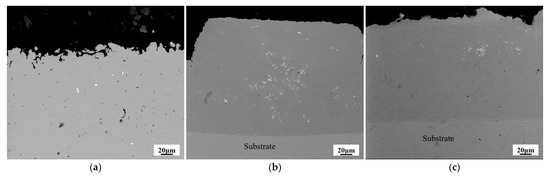 The cross-sectional SEM images of W–Cu composite coatings under different reverse duty cycles: (a) dr = 5%, (b) dr = 10%, and (c) dr = 15%, (J = 2 A/dm2, f = 1500 Hz and df = 40%).