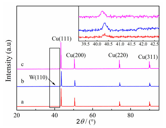 Figure 11 shows the XRD patterns of W–Cu composites with different reverse duty cycles. It can be seen that the diffraction peaks are consistent with the main peaks of Cu, corresponding to (111), (200), (220) and (311) planes of Cu. A small peak is observed at 2θ ≈ 40°, which corresponds to (110) planes of W. Apart from that, the other diffraction peaks of W were not obvious in XRD patterns. The inset in Figure 11 shows that the peak intensity of W (110) planes in the W–Cu composite (dr = 10%) is higher than the other two conditions, corresponding to relatively higher W content. The results of ICP show that the W content in W–Cu composites prepared under the conditions of dr = 5%, dr = 10% and dr = 15% is 1.16 wt.%, 8.33 wt.% and 2.97 wt.%, respectively.