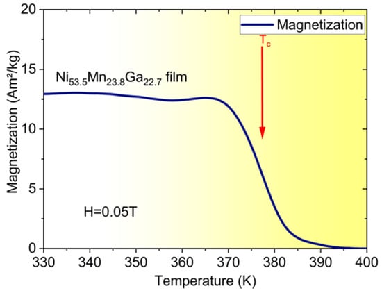 Ni–Mn–Ga films are chosen as a representative MSMA material. Ni–Mn–Ga films of 10 µm thickness are fabricated by RF magnetron sputtering in a high-purity argon atmosphere. The sputtering power is adjusted to control the Ni content and thus the phase transformation temperatures. Heat treatment conditions are tailored for optimal temperature-dependent change of magnetization at the ferromagnetic transition. Details on film fabrication and film properties can be found in [24,25] and references therein. Figure 1 shows magnetization versus temperature of a Ni-Mn-Ga film at a low magnetic field of 0.05 T. The material is in martensitic and ferromagnetic state at room temperature. In the temperature range between 330 and 350 K, martensitic phase transformation occurs, whereby the reverse transformation from austenite to martensite at 350 K gives rise to the small step-like feature in Figure 1. At the Curie temperature TC of about 375 K, magnetization shows a sharp change due to the ferromagnetic transition.