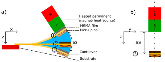 Layout and operation principle of the TMG device. A MSMA film of Ni-Mn-Ga and a pick-up coil are mounted at the cantilever front; (a) schematic side view of TMG device for three different deflection states (1)–(3), (b) front view for the maximum deflection state 3.