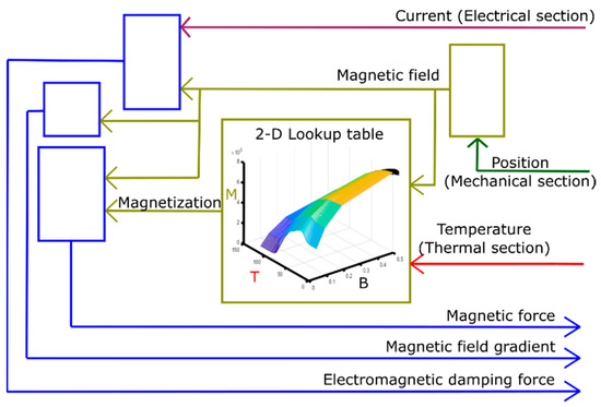 Magnetic section; temperature from thermal section, position from mechanical section and current from electrical section are taken in as inputs. The magnetic section computes magnetic force, magnetic field gradient and electromagnetic damping force as outputs. Magnetization data from material experiments are taken in as a lookup table.