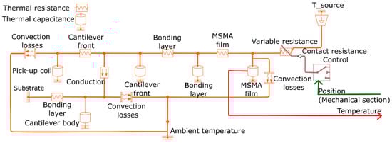 The thermal section of the LEM is used to study the heat flows in the TMG device. As shown in Figure 5, heat transfer in the system is modeled by representing the MSMA film, pick-up coil, bonding layers, cantilever front and body as thermal resistances and capacitances [31]. Heat transfer is indicated by bi-directional wire connections, whereby heat flows from higher to lower temperature. The intermittent heat transfer during mechanical contact between MSMA film and heat source is taken into account by control of a variable thermal resistance. For this purpose, a control box is connected to the heat source to model contact and non-contact instances during device operation based on the input of film position computed in the mechanical section. The thermal resistance strongly depends on the contact area and force. An appropriate value of thermal resistance is determined before by adapting simulated temperatures in test structures to corresponding experimental results. We thus obtain an empirical heat transfer coefficient Kcond given in Table A1. The contact area is assumed identical to the film area for the case of a polished magnet surface due to the smooth surface finish of the MSMA film. Heat is dissipated from the MSMA film by heat convection to the surrounding air and by heat conduction to the cantilever. It turns out that the temperature of the cantilever front is close to the minimum temperature of the MSMA film during resonant self-actuation showing only a minor temperature change as will be discussed below.