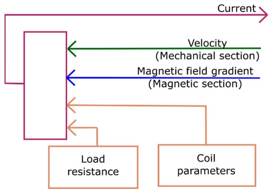 Electrical section; magnetic field gradient and velocity are taken in as inputs and a value for the current is generated as output. Coil parameters and load resistance are constants that are defined before.