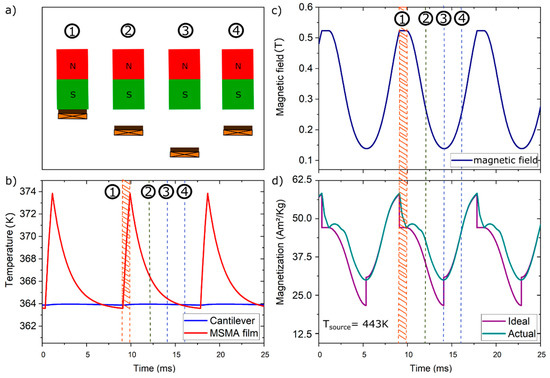 In the following, the LEM is used to study the time-dependent changes of temperature, magnetic field and corresponding magnetization in the Ni-Mn-Ga film during thermomagnetic cycling. Four stages of cantilever motion may be distinguished as illustrated in Figure 7a. The first stage (1) corresponds to the instant of heat transfer, when the Ni-Mn-Ga film is in mechanical contact to the heat source. (2) Upon deflection from the magnet, the Ni-Mn-Ga film and pick-up coil are accelerated to maximum speed corresponding to a maximum induced voltage. The third stage (3) is reached at the maximum distance to the magnet. (4) A second maximum induced voltage occurs during attraction of the Ni-Mn-Ga film by the magnet, when the pick-up-coil is at maximum speed.