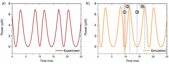 Experiment (a) and LEM simulation (b) of electrical power versus time of a TMG device based on a Ni-Mn-Ga film of 10 µm thickness. The four stages of cantilever motion (1)–(4) are highlighted (compare Figure 7a).