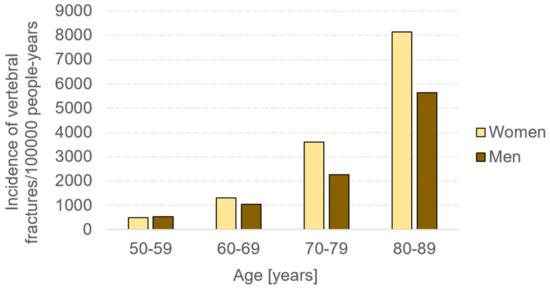 Incidence of vertebral fractures in Minnesota in years 2009–2010. The trend shows higher values for women >60 years old [5].