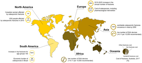 The number of women exceeding a fracture threshold is six times higher than for men. This parameter, i.e., the fracture threshold, is defined as the 10 years probability of a major fracture equivalent to that of a woman with no other clinical risk factors [6]. This gender difference could also be explained by introducing the role played by osteoporosis, that is four times more common in females than in males [7]. This is due to their smaller bone size and the advent of menopause, since osteoporosis is closely related to a lack of estrogen [8]. Often, when fractures extend to the vertebral bodies or to the hip, patients cannot be treated in a day hospital, but need to be bedridden, involving medical and nursing staff for assistance. This raises not only an enormous health concern, but also an economic burden for disease management. The health problem is also connected with the concept of frailty, defined as an increased vulnerability due to long-term hospitalization for fracture treatment, impaired quality of life and disability [9]. As regards economic aspects, a projection of worldwide direct and indirect expenses related to the identification and treatment of hip osteoporotic fractures is expected to rise almost to USD 100 billion in sixty years, starting from an evaluation of USD 34.8 billion in 1990 [4]. An overview of the economic impact of fracture treatment and fracture prevention in different countries [10] is reported in Figure 2 [11].