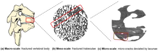 At all bone hierarchical scales, bone toughness deteriorates dramatically with aging [25] and it is necessary to identify proper imaging techniques to visualize changes in bone morphology. This is essential in order to measure and predict bone fragility. Several imaging techniques at the multiscale [26] are currently available: in general, clinical images can be collected with radiography, dual X-ray absorptiometry (DXA) or magnetic resonance imaging (MRI). These techniques offer an overview of the whole bone with a lower resolution, compared, for example, to micro-computed tomography (micro-CT) [27]. This latter technique increases the resolution but reduces the analyzed region. The different contribution of imaging techniques in identifying bone fractures at the multiscale (fracture at the macro-scale, micro-cracks at the micro-scale) is the first point that will be discussed in the current review. For example, a common clinical outcome from DXA is the evaluation of bone mineral density (BMD), which is an indicator of bone quantity: low BMD values indicate the presence of osteopenia or osteoporosis, so a bone that is more prone to fracture. However, it has been demonstrated [28,29] that, in the case of vertebral fractures, BMD can only predict the 70% of them [30]. BMD is therefore a limited predictor of fracture risk [31,32]. It should be combined with measures of bone quality, that cover geometrical and material features of the macro- and micro-architecture [33]. For the identification of micro-architectural features and the comprehension of their role in damage propagation, micro-scale imaging techniques such as micro-CT or synchrotron radiation [34] are used in combination with subject-specific computational models [35,36]. In recent decades, they have assumed a growing importance, according to the 3R principle that proposes the replacement, reduction and refinement of animal experiments in favor of in silico models. Micro-scale observations permit us to quantify micro-architectural parameters, such as bone volume fraction, bone surface to tissue volume, degree of anisotropy, etc. [37], but also parameters related to the lacunar network [36]. The extrapolation of these micro-scale parameters could be helpful in the future to make clinical decisions about specific therapies for bone fragility treatment. A first attempt in organizing these multi-scale parameters will be presented in this review.