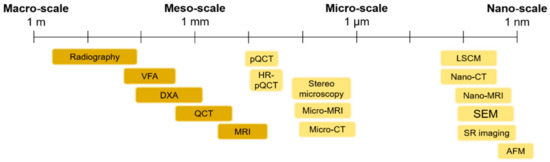 An overview of the main imaging techniques to assess bone damage at different scales. Macro- and meso-scale techniques are depicted in a darker color, while micro- and nano-scale imaging techniques are represented in a brighter color. VFA: Vertebral Fracture Assessment; QCT: Quantitative Computed Tomography; MRI: Magnetic Resonance Imaging; pQCT: peripheral Quantitative Computed Tomography; Micro-CT: Micro Computed Tomography; LSCM: Laser Scanning Confocal Microscopy; SEM: Scanning Electron Microscopy; SR imaging: Synchrotron Radiation imaging; AFM: Atomic Force Microscopy.